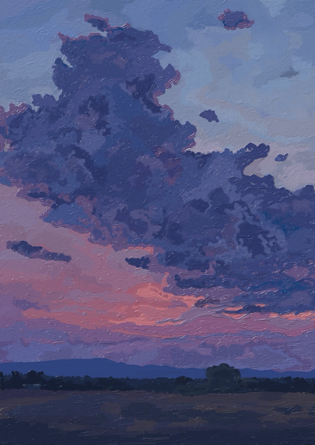 이 그림은 저녁 하늘을 추상적으로 담아낸 유화풍 아트 포스터입니다.
